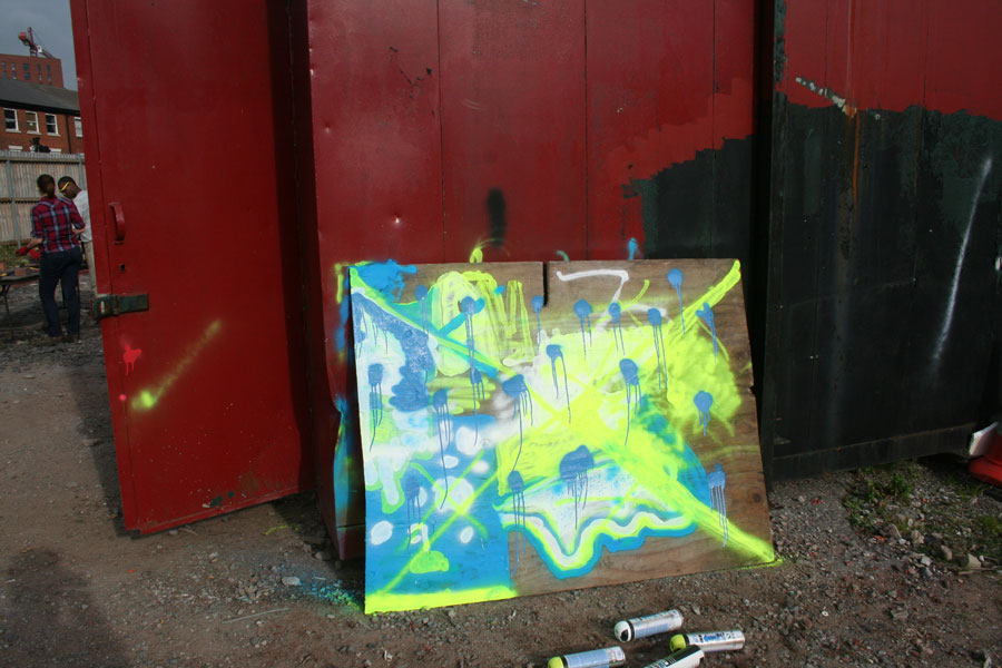 On Wednesday, as I’d just about recovered, the site was attacked again- the third time in less than a week. It was Bonfire Night. I’d heard there was a spectacular one roaring on the estate. The next morning realising courtesy of The Salford Wall. The timber and hoarding panels I’d been given to make into worktables were gone. Also a few unused pallets. In a way, I could accept this. In the abyss, there was a need and it was fulfilled. But it didn’t stop there. There had to be visible violence left.